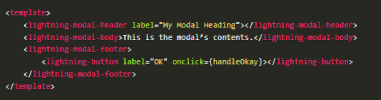 This component doesn’t use a lightning-modal tag. Instead, the modal’s HTML template uses helper lightning-modal components to make the modal’s header, footer and body. The lightning-modal-body component is required and the others are optional.